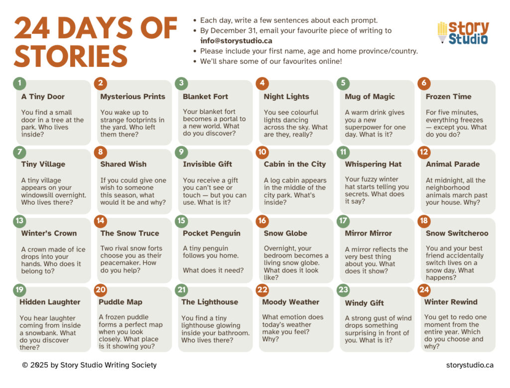 Click the image to download a free PDF and follow along each day. Write a few sentences in response to each prompt. By December 31, email your favourite piece of writing to info@storystudio.ca (Maximum 250 words. Please include your first name, age and home province/country.)