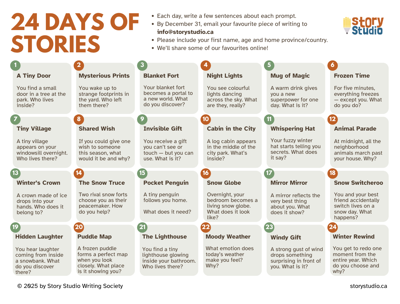 Click to download the free PDF below and follow along each day. Write a few sentences in response to each prompt. By December 31, email your favourite piece of writing to info@storystudio.ca (Maximum 250 words. Please include your first name, age and home province/country.)
